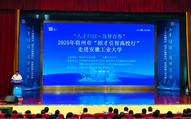 2025年5月27日,由宿州市人民政府、安徽工业大学主办,中共宿州市委人才工作局、宿州市人力资源和社会保障局、安徽工业大学学生工作部(大学生就业创业指导中心)承办的“人才归宿·筑梦青春”2025年宿州市“招才引智高校行”走进安徽工业大学活动成功举办。宿州市政协副主席赵素华、安徽工业大学党委副书记王俊出席并致辞。中共宿州市委人才工作局副局长王茹主持活动,宿州市人力资源和社会保障局党组成员、副局长何龙与安徽工业大学学工部副部长赵传刚签署战略合作协议。
