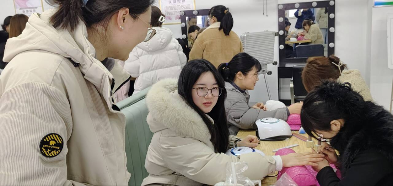 集体合影留念后,全体人员跟随技师学院相关负责人的脚步,依次参观了京东校园实训中心、电商直播实训室、美容美发与形象设计实训场地等特色教学场所,沉浸式观摩职业技能实操场景,体验美甲美妆服务。活动期间,技师学院为女同志们送上了多种口味的暖心奶茶、学生自制3D打印纪念品,大家还参观了非遗面塑、韩式裱花等师生作品,品尝手工甜品,现场气氛轻松愉悦。
