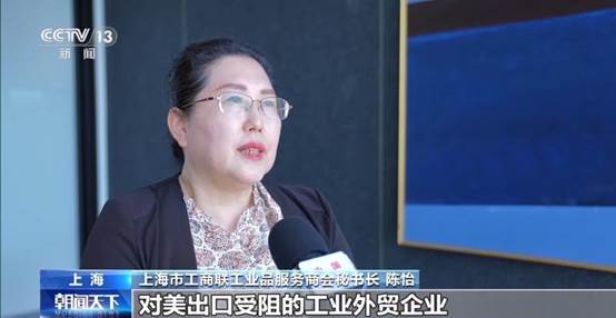 上海市工商联工业品服务商会秘书长 陈怡:对美出口受阻的工业外贸企业,可以通过我们的平台链接快速入驻工业品电商服务平台。同时我们在虹桥工业品全球服务中心开通了体验中心、交易中心、贸易服务中心,帮助我们众多的中小企业提升能级。